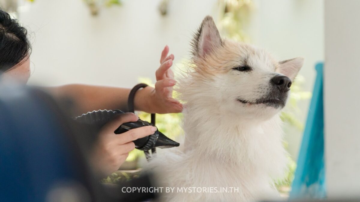 ขั้นตอนที่ 6 เป่าขนโดยใช้ไดร์เป่าขนน้องหมา เริ่มจากลำตัวของน้องหมา เป่าตั้งแต่โคนจรดปลายเส้นขนโดยใช้หวีช่วย เพื่อกำจัดความชื้นจากน้ำให้หมดไปค่ะ
